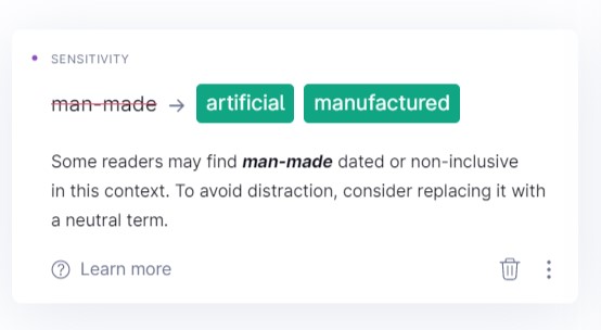 Sorry, but I find this one to be a miss. One, Grammarly’s suggestions are suggestions, not a conspiracy. Twitter shrieks at me for using the word “moron,” too. I see no problem with switching out terms like “manmade” or “fireman” for more inclusive terms. Then again, I’m not a man.